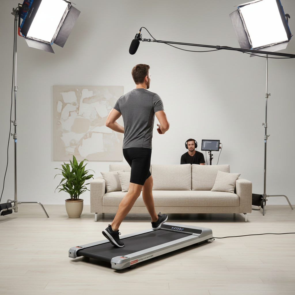 «Slimtech S130 — это беговая дорожка для съёмок в стиле “современный интерьер без визуального шума”. Герой идёт по тонкой платформе, а вокруг — чистое пространство, которое режиссёр заполняет как хочет.»