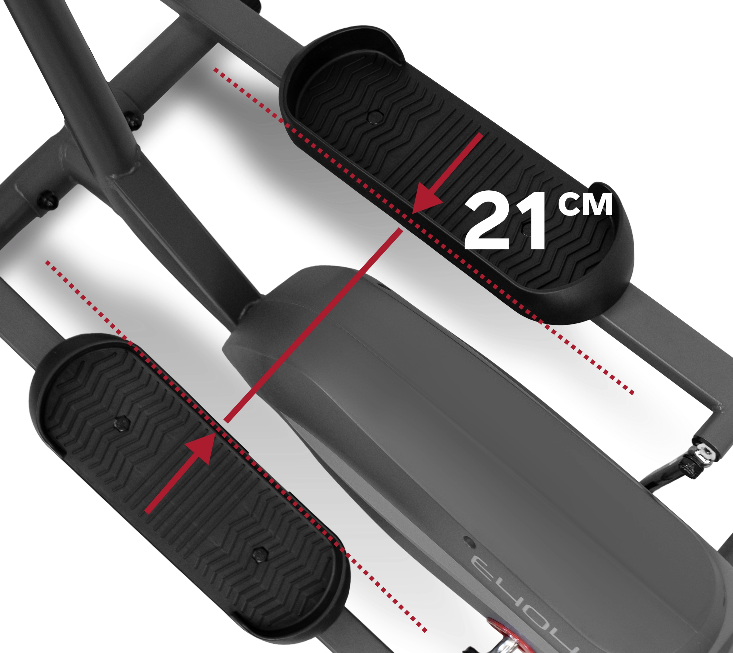 Длина шага тренажера – 330 мм, это идеальное решение для пользователей среднего и небольшого роста. Этот параметр обеспечивает естественные и комфортные движения, снижая нагрузку на суставы. Q-фактор (расстояние между педалями) в 21 см обеспечивает правильную постановку ног и дополнительную стабильность во время тренировки.Плавный ход и удобство тренировок