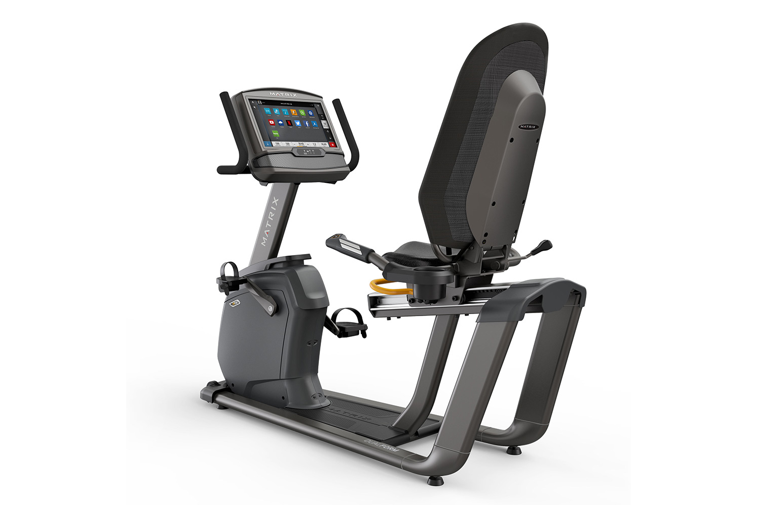 Горизонтальный велотренажер премиального качества Matrix R50 XIR, разработан для эффективных тренировок дома, с функционалом тренажеров установленных в фитнес клубах.
